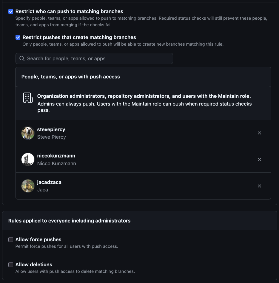 @stevepiercy That looks good. The important thing there is that near the bottom "allow force pushes" remains unchecked.